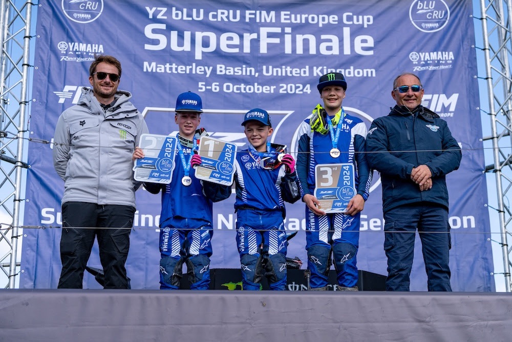 Left to right: Infront Moto Racing CEO David Luongo, 2024 YZ bLUcRU 85 Podium, FIM Europe Chairman Andrea Barbieri