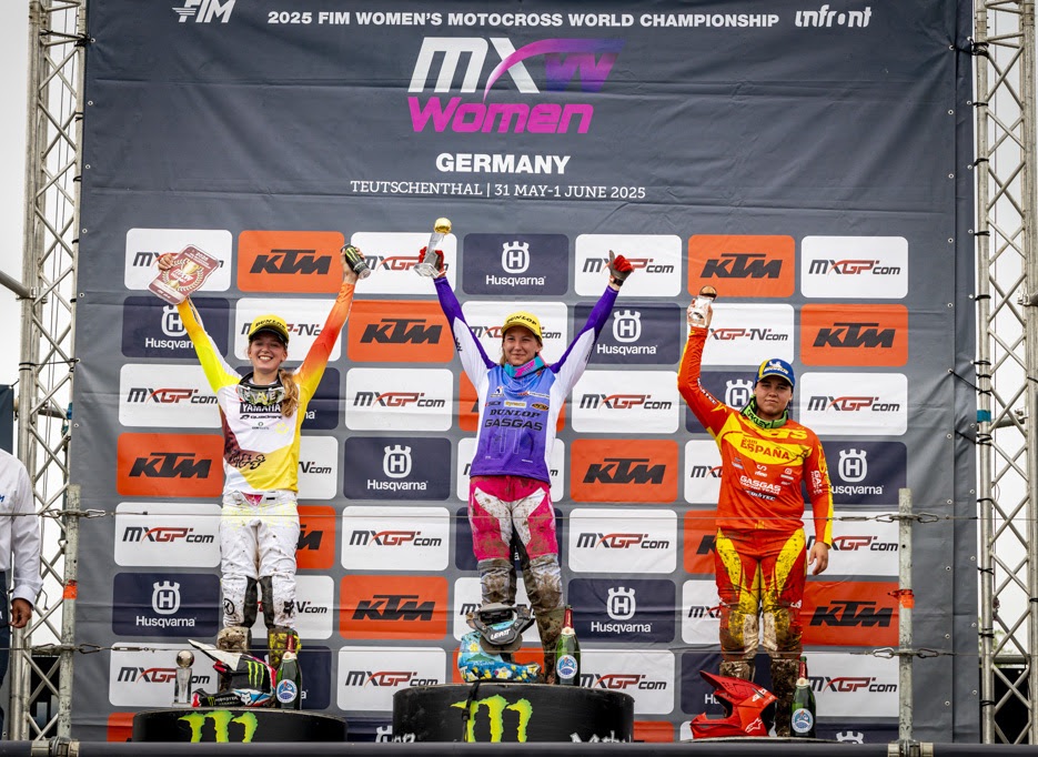 TEUTSCHENTHAL (Germany) 1 June 2025 – The FIM Women’s Motocross World Championship riders were greeted with two vastly different challenges at the iconic Teutschenthal circuit during the Liqui Moly MXGP of Germany. Saturday’s Race 1 unfolded under hot and sunny skies, where the dry, hard-pack surface tested throttle control and precision. The second race however, brought a slicker, rain-affected track, transforming the terrain into a more technical and unpredictable battlefield.