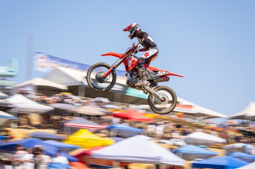 The final moto of the afternoon featured the hottest temperatures of the day and was shortened by five minutes as a precautionary measure. Out of the gate, it was the Hondas of Jett and Hunter Lawrence alongside Monster Energy Yamaha Star Racing’s Cooper Webb, who inched ahead for the Pro Motocross Holeshot. Meanwhile, Tomac made contact with another rider off the start and was mired outside the top 20 in the running order. Back up front, Jett Lawrence sprinted out to a multi-second lead as teammates Cooper and Webb moved into second and third, respectively.