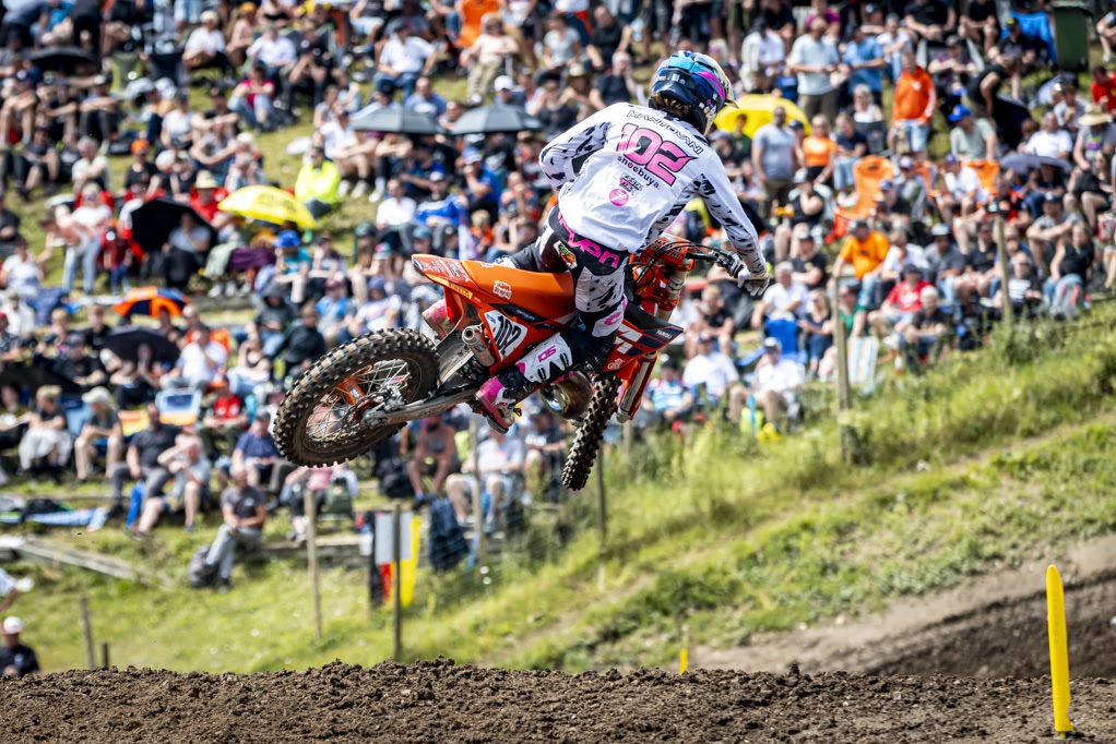Further back, Fantic Factory Racing EMX’ Francesco Bellei moved up into fifth after a poor start, edging past KTM Sarholz Racing Team’s Moritz Ernecker, while Mantovani was holding third until a small tip-over on lap 6 dropped him briefly back into a battle with Mannini. Despite the mishap, Mantovani remounted quickly and fended off the attack to keep his podium position.