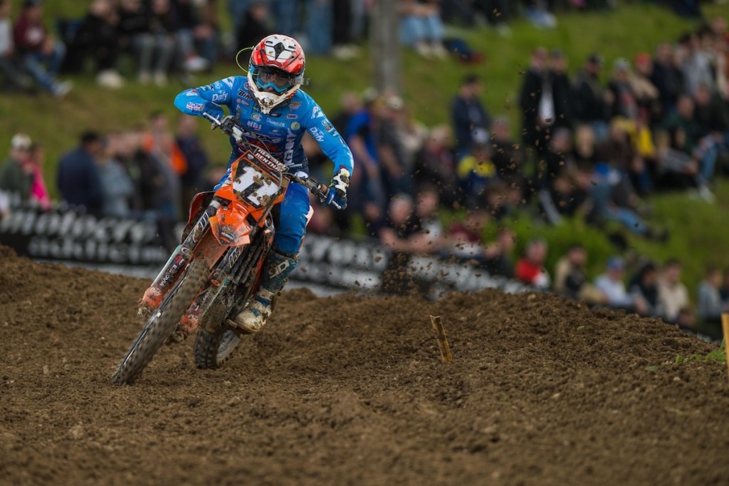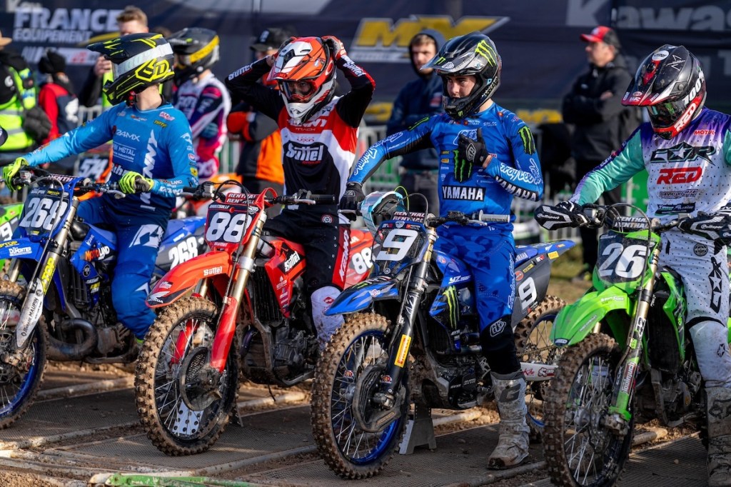Champion de France et d’Europe MX2 2024, nouvel officiel KRT, Mathis Valin a claqué la pôle le matin avant de s’offrir la première manche en contrôlant de bout en bout. Toujours inscrit dans un dynamique positive, MV717 a fait forte impression. Très belle manche également de Thibault Bénistant pour sa première course de l’année, malgré un mal de bras. L’officiel Yamaha Monster termine second devant les deux frères Reisulis, Janis et Karlis. Sur le podium du Touquet junior une semaine plutôt, Francisco Garcia place la première KX Bud Racing dans le top cinq. Très belle P6 d’Adrien Petit au guidon de sa 250 YZ 2T. Il devance l’Australien Cannon pour ses débuts en France et Thibault Maupin. Victime d’une chute en début de course, Boisramé sauve les points de la onzième place juste derrière Jules Piètre. La seconde manche ressemble à un copier/coller de la première. Après un holeshot signé Bénistant, Valin passe à l’attaque immédiatement pour prendre la tête et creuser l’écart. L’officiel Yamaha Hutten Metaal se fait distancer et termine une nouvelle fois second. Comme en première manche, Janis et Karlis Reisulis suivent alors que Garcia enchaine un nouveau top cinq devant Boisramé. Mathis Valin claque le doublé et prouve qu’il sera l’un des hommes à suivre de très près en mondial MX2. Thibault Bénistant (2/2) et Janis Reisulis (3/3) montent sur le podium.
