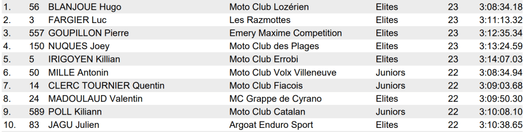 À 30 minutes du drapeau à damier le classement scratch évolue. Clément Daussat Daure prend le commandement devant Sandro Garcia et Anthony Breuil, qui cassera lui aussi en fin de course.