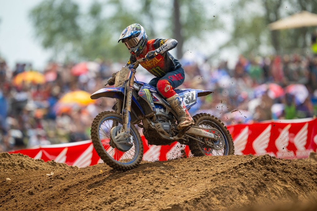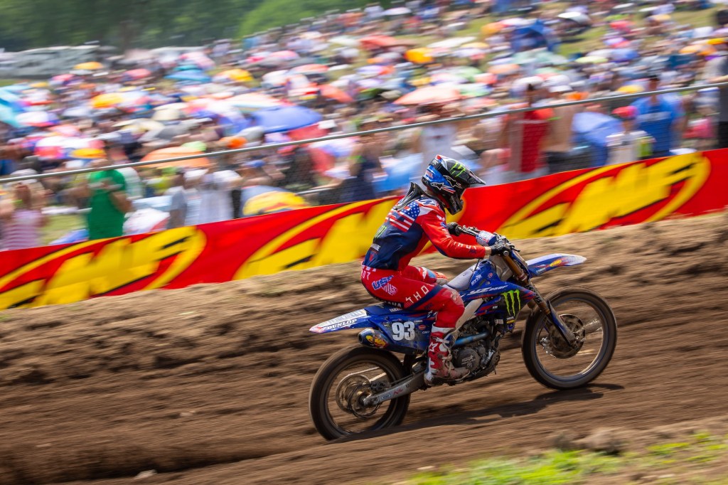 The top three settled in through the middle of the moto, with Jett Lawrence moving out to a lead of about five seconds. However, as the moto entered its final 10 minutes considerable smoke started to come out of Tomac’s Yamaha. He eventually came to a stop, which ultimately brought his moto to a premature end. That misfortune left the battle for third to be settled between Plessinger and Hampshire, with the Husqvarna rider able to make the move in the closing stages of the moto.