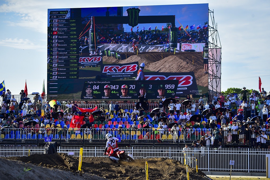 Ruben Fernandez had tucked into fifth, behind Jonass and ahead of Glenn Coldenhoff, whose Fantic Factory Racing MXGP teammate Andrea Bonacorsi was ninth behind the two title combatants, while Jeremy Seewer started well in tenth for Aruba.it Ducati Factory MX Team.