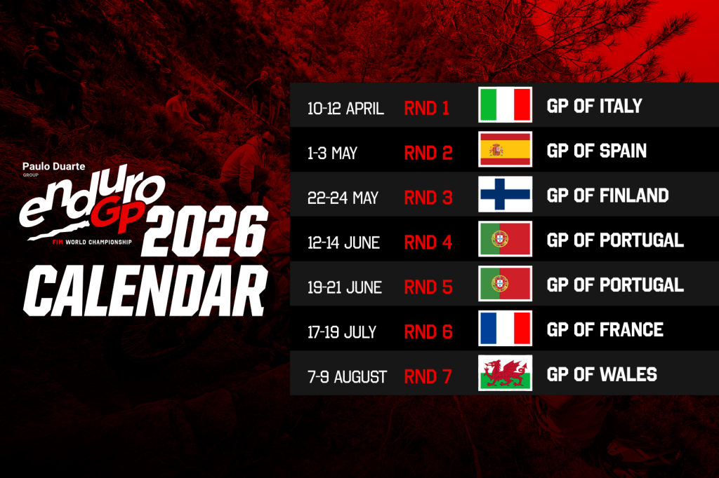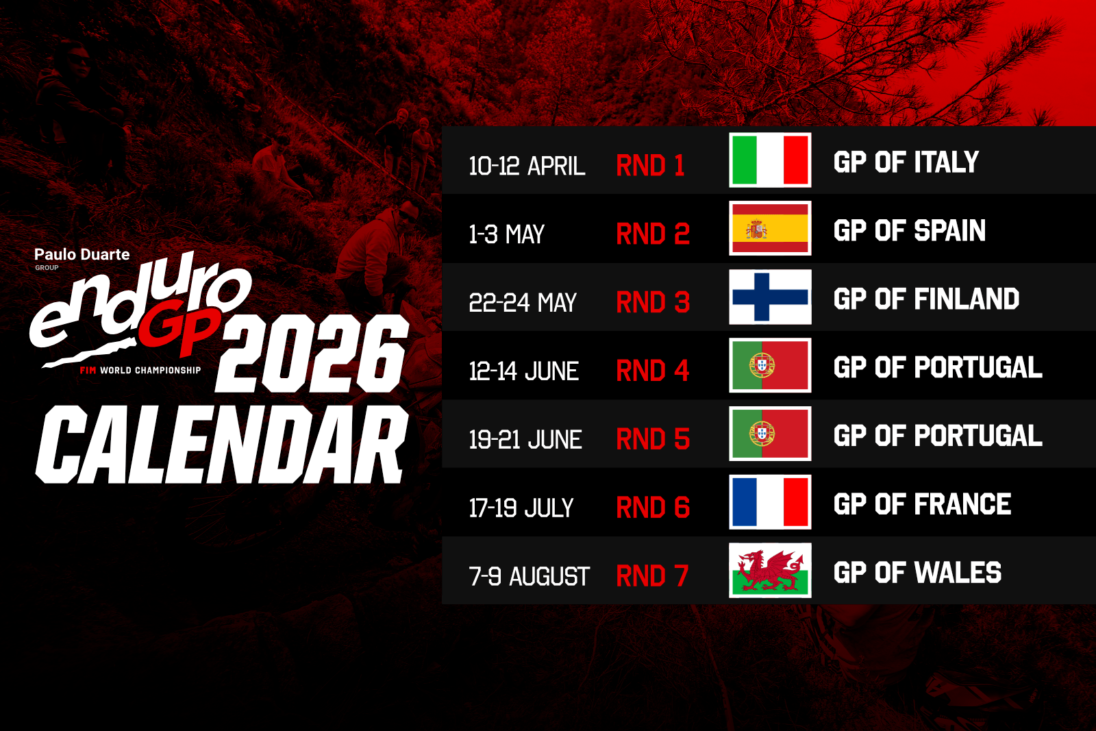 Prime Stadium Eventos, promoters of the Paulo Duarte FIM EnduroGP World Championship, together with the FIM, are pleased to confirm the provisional calendar for the 2026 season.