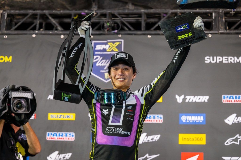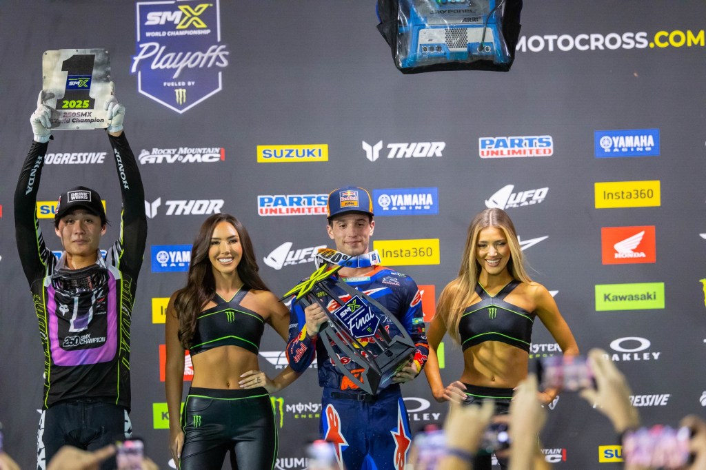At the moto’s midpoint, Shimoda reached second place and Deegan slowed to allow Hammaker to tighten back up to them. Over the next laps, Deegan instigated contact against Shimoda no less than three times, and the third impact put both riders on the ground. Shimoda quickly remounted in second place while Deegan walked away from his bike with what was later diagnosed as a broken collarbone. The games up front allowed Red Bull KTM Factory Racing’s Tom Vialle to catch Shimoda and pass him with less than two laps remaining. With Hammaker leading, Vialle holding second, and Shimoda in third, the title would go to Shimoda with the night’s overall going to Hammaker. But Shimoda put on a final burst and passed Vialle in the final corner to earn second in the moto, an overall victory for the night, and secure the 2025 SMX World Championship. The title marks Shimoda’s first professional title and he becomes the first Japanese rider to earn an SMX, SX, or MX title.