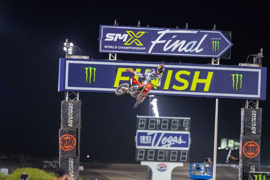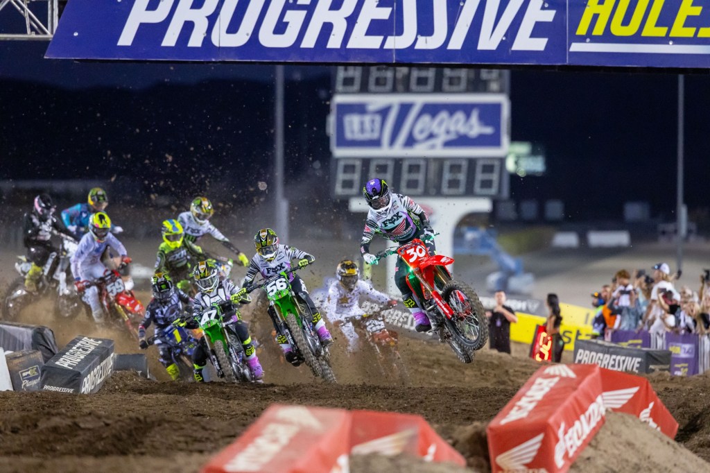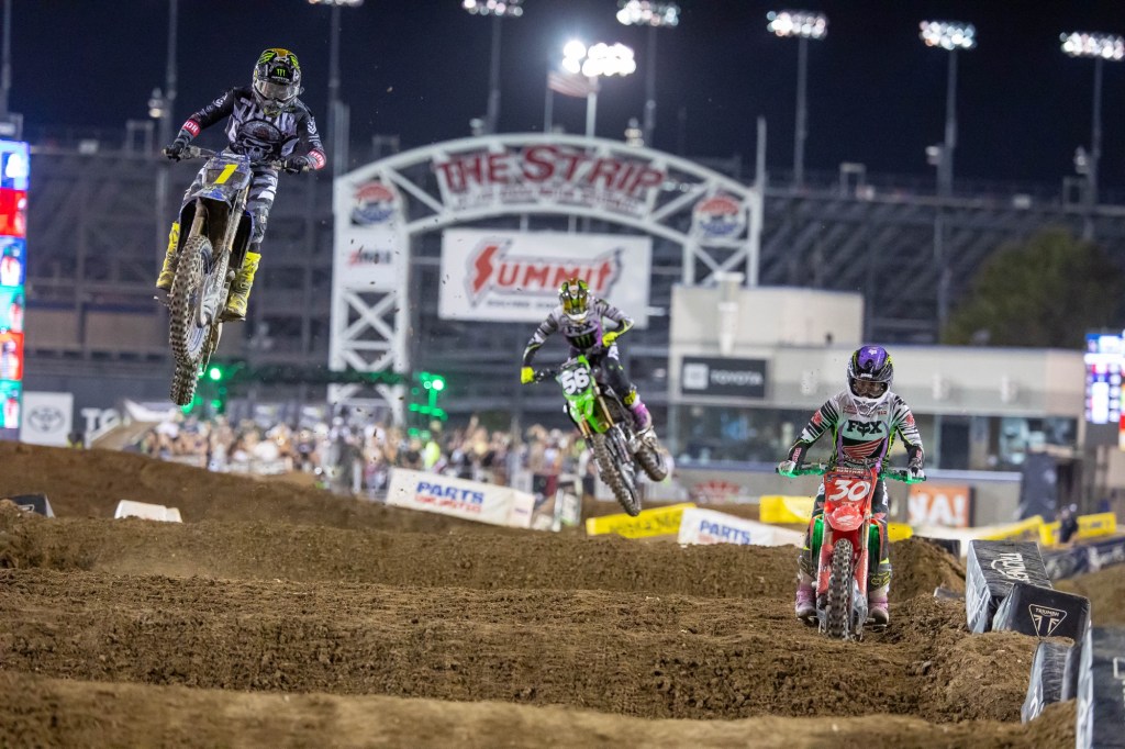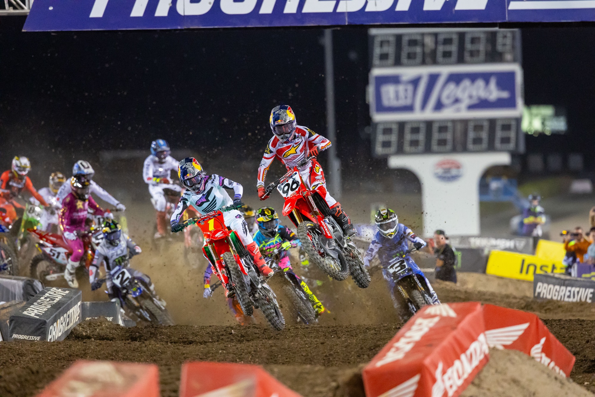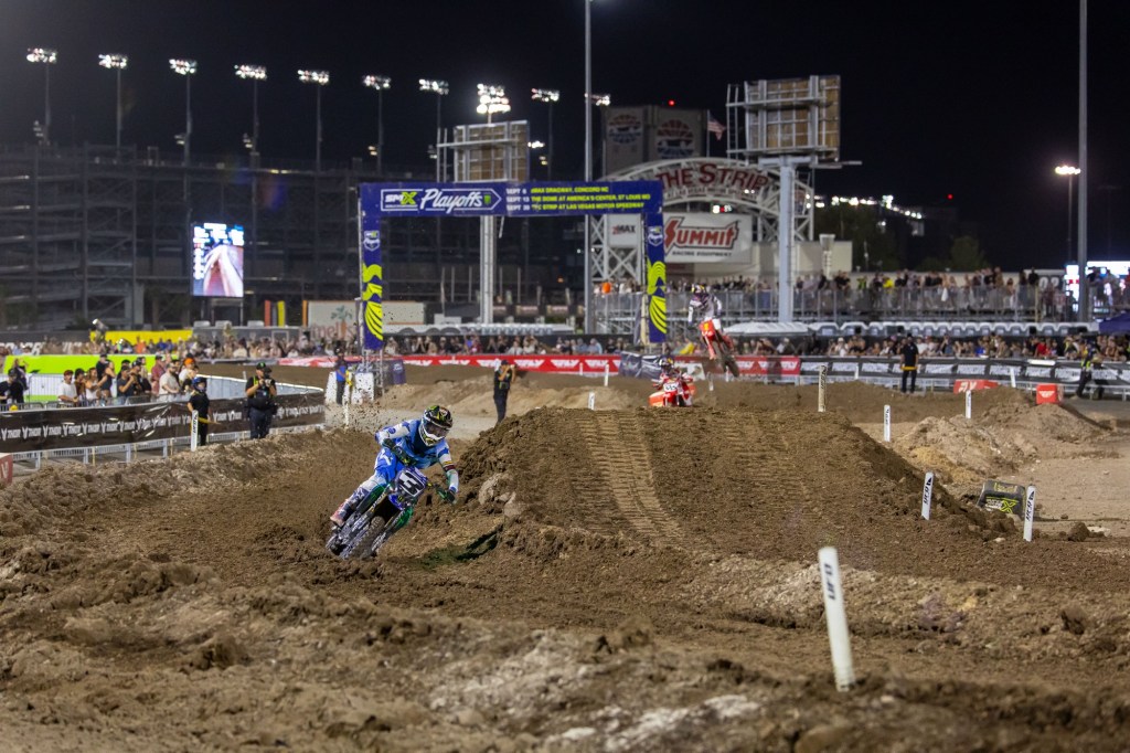 Team Honda HRC Progressive’s Hunter Lawrence, entering the race with enough points that a victory would bring him his first 450SMX title, toughed out a win in the second moto despite entering the event under the weather. Hunter’s third-place finish in the opening moto netted him second overall at the Vegas race as well as in the championship, which brought him a $500,000 championship runner-up bonus. Monster Energy Yamaha Star Racing’s Eli Tomac battled up front in both motos and finished the night with (2-3) moto scores. Tomac wrapped up his season with a third place result in the moto, the event, and the championship, which came with a $250,000 bonus.