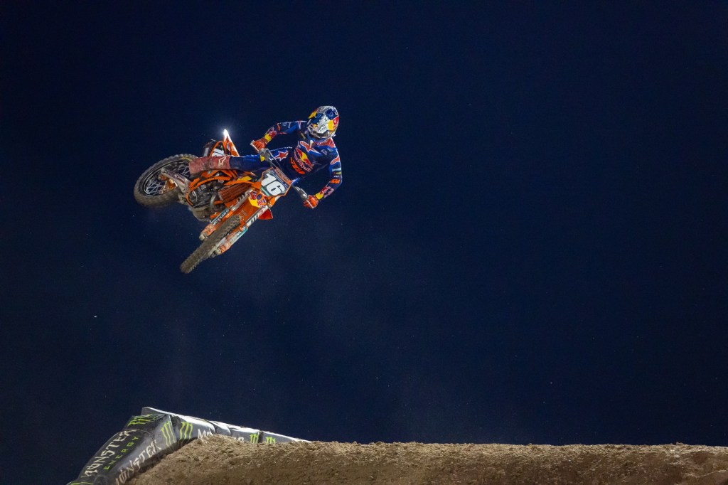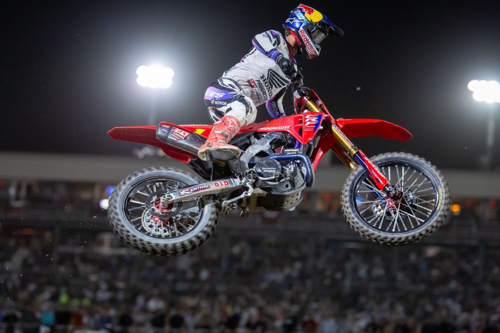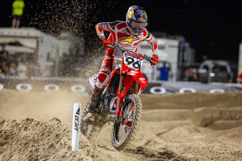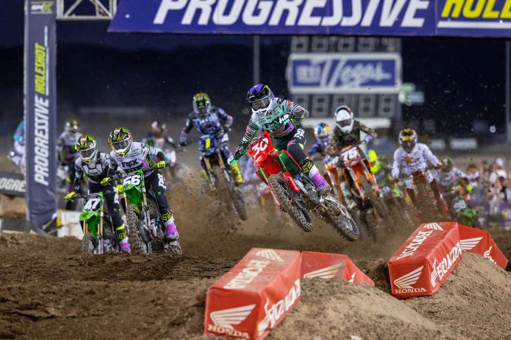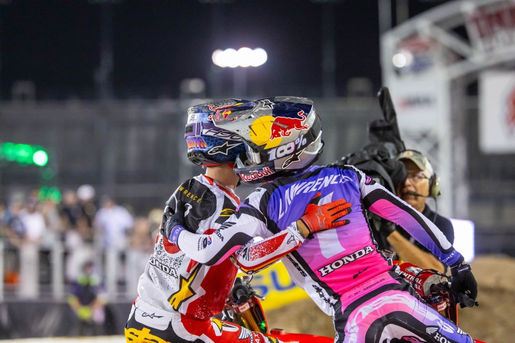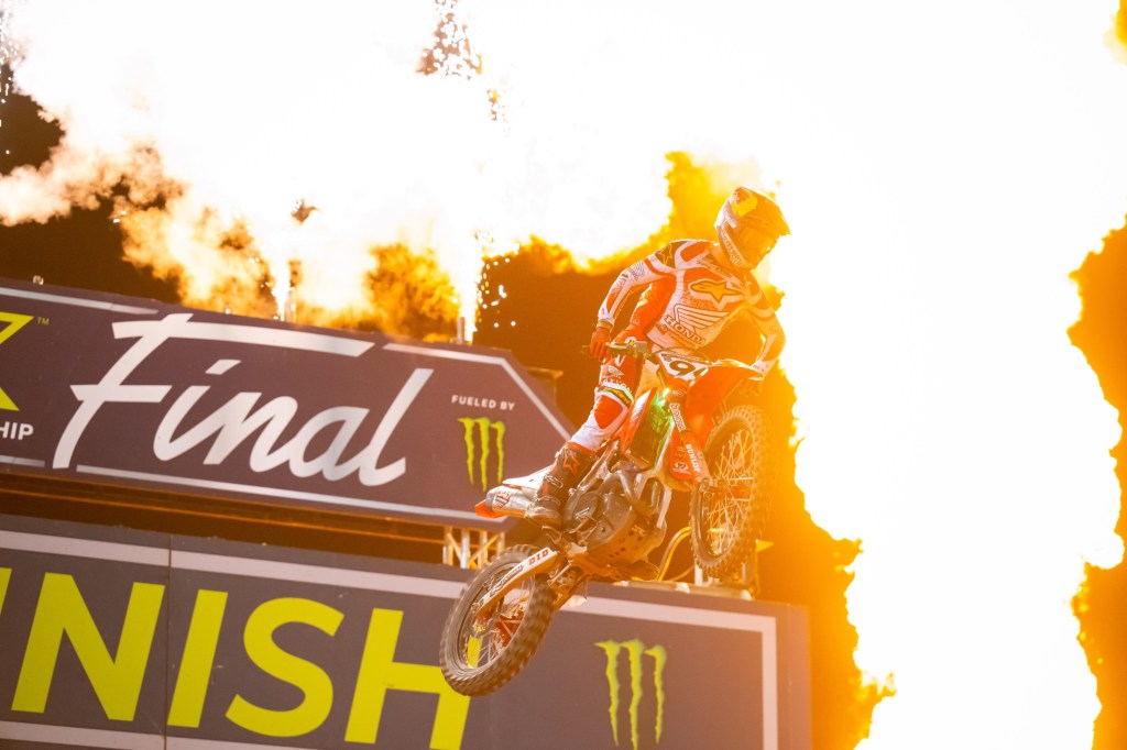 Team Honda HRC Progressive’s Hunter Lawrence, entering the race with enough points that a victory would bring him his first 450SMX title, toughed out a win in the second moto despite entering the event under the weather. Hunter’s third-place finish in the opening moto netted him second overall at the Vegas race as well as in the championship, which brought him a $500,000 championship runner-up bonus. Monster Energy Yamaha Star Racing’s Eli Tomac battled up front in both motos and finished the night with (2-3) moto scores. Tomac wrapped up his season with a third place result in the moto, the event, and the championship, which came with a $250,000 bonus.