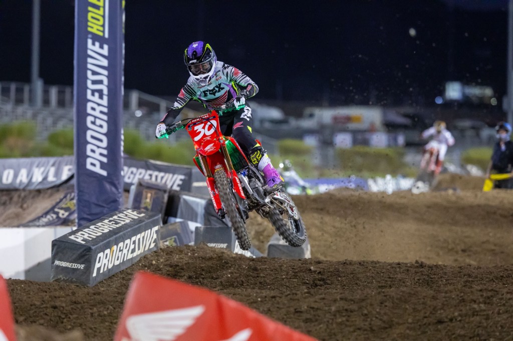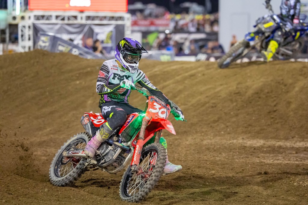“I kind of slipped out on the start. I’m not going to lie, I was a little nervous. But I think we made good passes in the first few laps. I caught Seth, passed him. [Then] I caught Deegan, but he slowed to let me pass, so I kinda knew already [that] something’s going to happen and he might attack pretty crazy, which he did. At one moment I had my leg cramped and everything because of him hitting, but I just want to say thank you to my family first, my trainer, my whole team, my mechanic Ben. You know, it’s only a three-round [postseason] series, but for me, I think getting this title and finishing off the year good, with the [red] plate, that’s what I needed. And yeah, confidence booster, for sure.” – Jo Shimoda