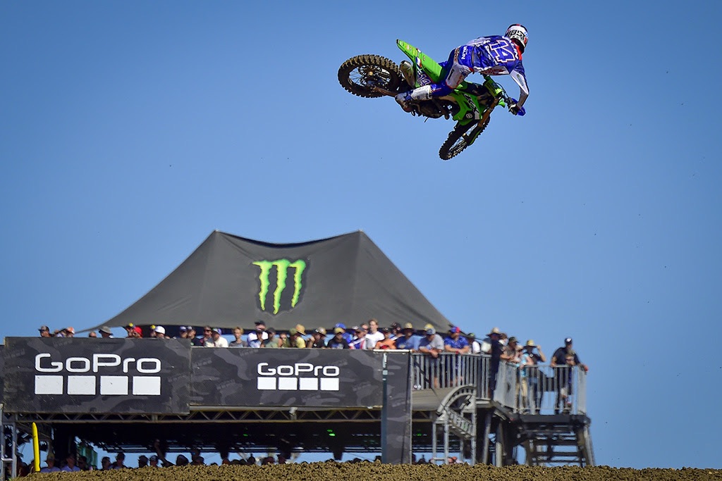 Lawrence’s teammate Webster had to pick himself off the floor in turn one, and had got up to 27th by the end of the first full lap! Febvre washed out in the second turn of the third lap, allowing Tomac and Sacha Coenen past. The Frenchman took two laps to get back around Coenen’s 250cc Red Bull KTM, but Tomac was just a little out of reach.