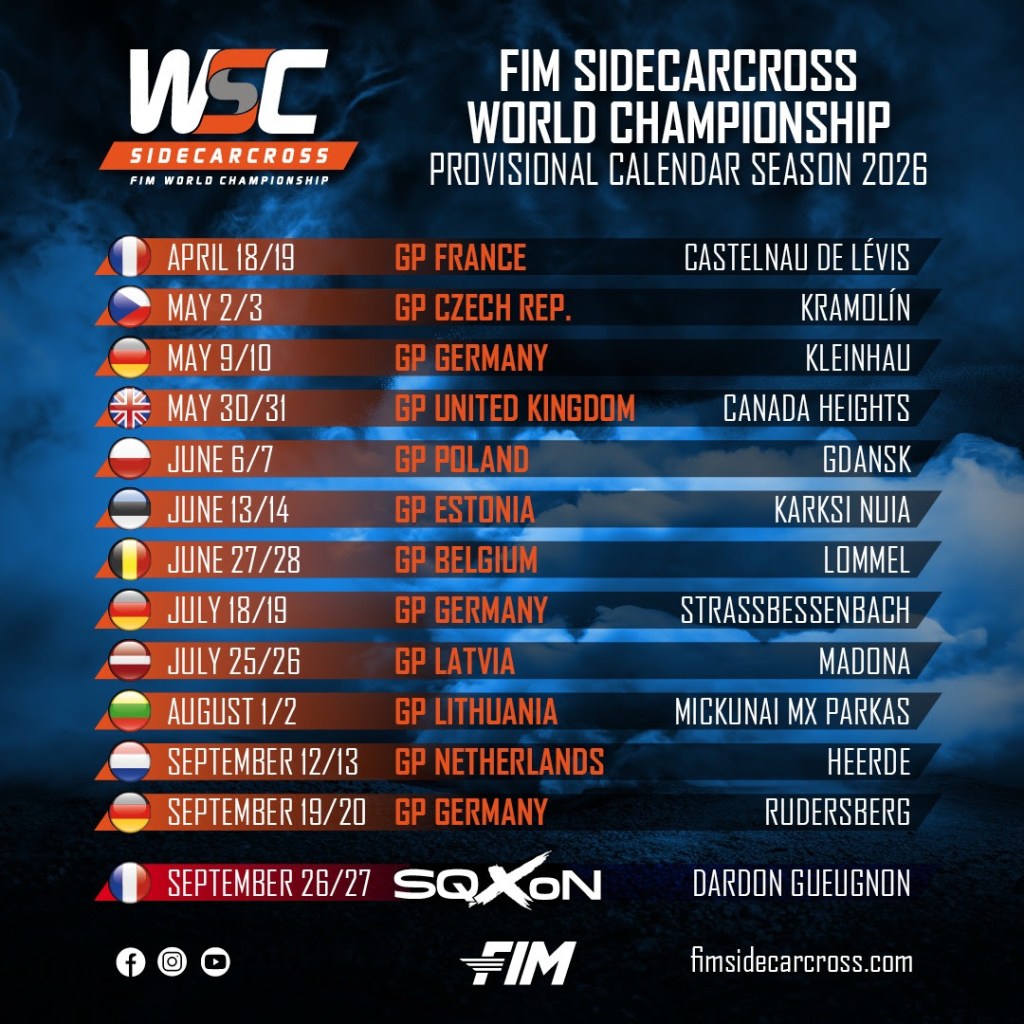 The FIM and APO Multimedia are pleased to announce the 2026 provisional calendars for the FIM SidecarCross World Championship (WSC) and FIM SidecarCross & QuadCross of Nations (SQXoN).