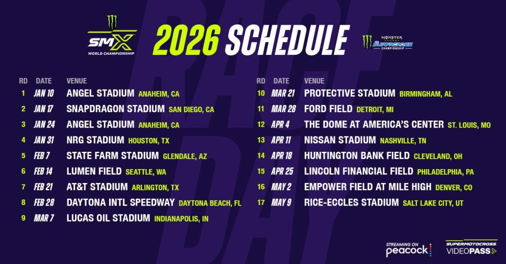 Monster Energy AMA Supercross, part of the Monster Energy SMX World ChampionshipTMseries, is the most competitive and highest-profile off-road motorcycle racing championship in the world, attracting the top professional racers from around the globe including Jett and Hunter Lawrence from Australia, Jo Shimoda from Japan, Ken Roczen from Germany, and Haiden Deegan from the United States. The 17-round indoor stadium season of Supercross will visit 16 cities in 13 states spread out across the country starting in January at Angel Stadium in Anaheim, California. Returning to the 2026 schedule will be stops in Houston, Texas at NRG Stadium and Nashville, Tennessee at Nissan Stadium, and for the first time in more than 30 years the series will race in Cleveland, Ohio at Huntington Bank Field. The season will conclude in May at Rice-Eccles Stadium in Salt Lake City.