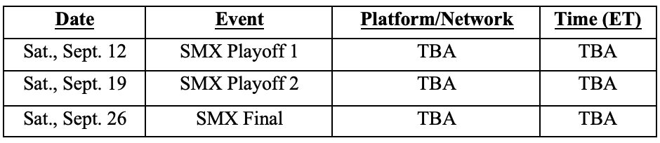 The SMX World Championship Playoffs will culminate with two playoff rounds (Sept. 12, Sept. 19) and the SMX World Championship Final (Sept. 26), with further programming details to be released at a later date.