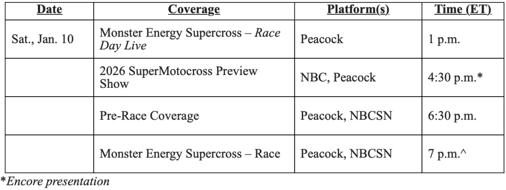 STAMFORD, Conn. – Jan. 6, 2025 – The 2026 Monster Energy SMX World ChampionshipTM series and Monster Energy AMA Supercross season begins this Saturday, Jan. 10, from Angel Stadium of Anaheim in California, starting live at 6:30 p.m. ET with exclusive pre-race coverage on Peacock followed by the race at 7 p.m. ET on Peacock and NBCSN.
