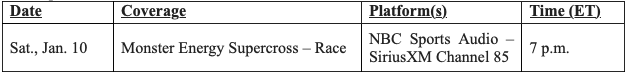 Throughout the season, all 31 SMX World Championship rounds will be presented on NBC Sports Audio on SiriusXM Channel 85. To learn more about NBC Sports’ wide variety of sports talk radio shows and events, click here.