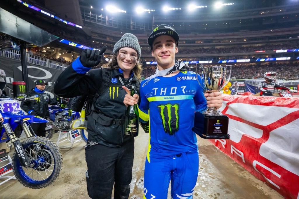 For the second week in-a-row, the action of the 450SMX and 250SMX classes was complemented by the budding stars of SMX Next – Supercross. An elite group of the top A and B class prospects in amateur motocross took to the track once again with a field of 21 racers, with last week’s winner Kayden Minear missing in action after the 18-year-old Australian crashed aboard his Monster Energy Yamaha Star Racing machine during qualifying and was forced to sit out. As the gate dropped on the 8 Minute + 1 Lap race, it was 16-year-old Monster Energy Kawasaki Team Green rider Vincent Wey who put himself out front early with the holeshot. It wasn’t long before 17-year-old Triumph Racing America rider Deacon Denno, a Texas native, took the lead to the delight of the home crowd. As the race wore on, all eyes were on another Texan, 16-year-old Caden Dudney, who charged to the lead aboard his Monster Energy Yamaha Star Racing ride and stormed to his first SMX Next victory by a margin of 1.5 seconds over Denno for a Texas 1-2. Wey crashed out of third in the closing laps while he attempted to pass Denno for second, which allowed 18-year-old Monster Energy Yamaha Star Racing rider Landed Gordon to finish third.