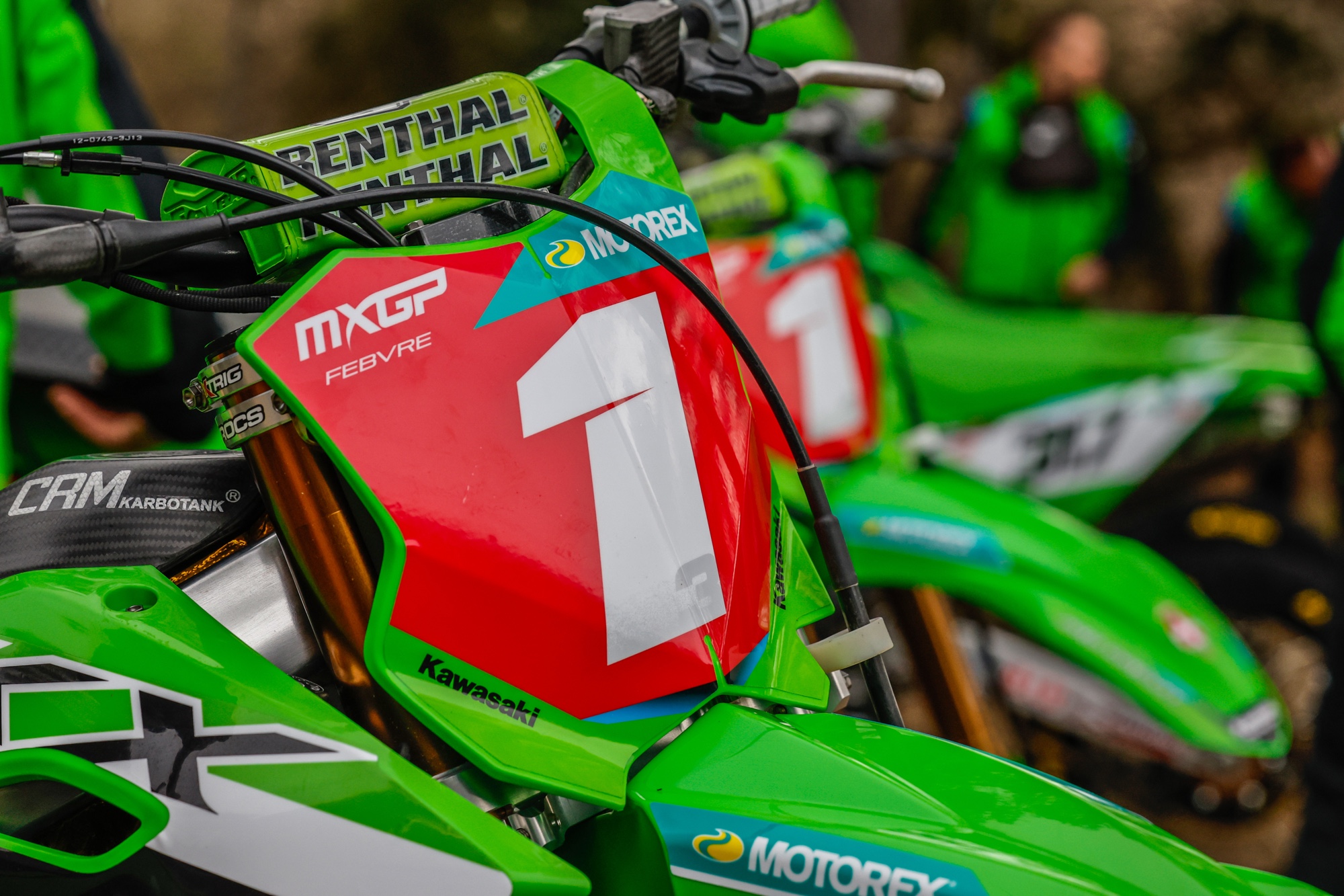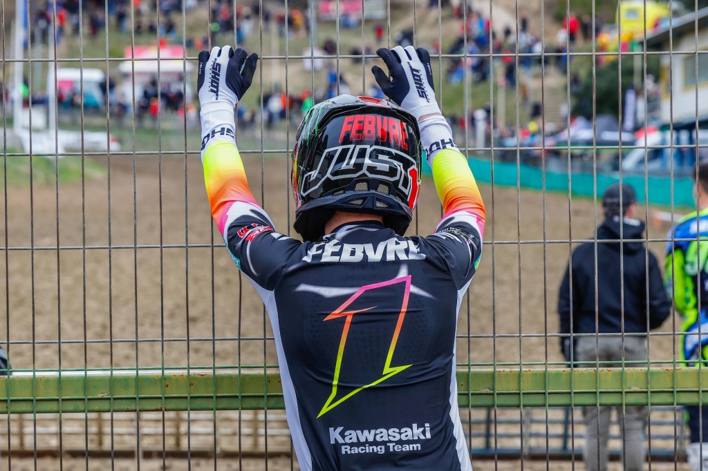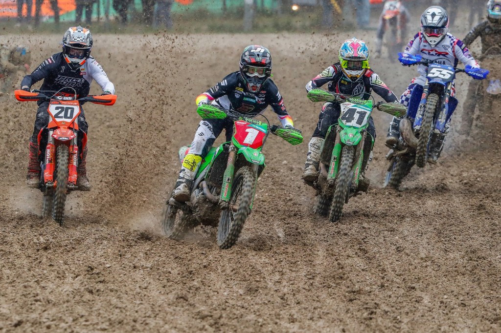 After dry training sessions in the morning rain began to fall just after midday but it could not dampen the enthusiasm of the large crowd which had gathered to see their heroes, in particular reigning MXGP world champion Romain Febvre who was racing for the first time with the #1 plate on his Kawasaki KX450-SR. The Frenchman emerged victorious from a first moto duel with his leading adversary of the previous year’s world championship campaign and added another clear victory by nearly half a minute in the second moto as the track became heavier in the incessant rain. He was poised for a perfect day as he also led race three but conditions were becoming ever more brutal and two mistakes pushed him downfield; undaunted he recovered to sixth by the end of the moto to earn second place on the overall podium. Pauls Jonass had three solid rides for 3-4-2 moto finishes to join his KRT teammate on the podium.