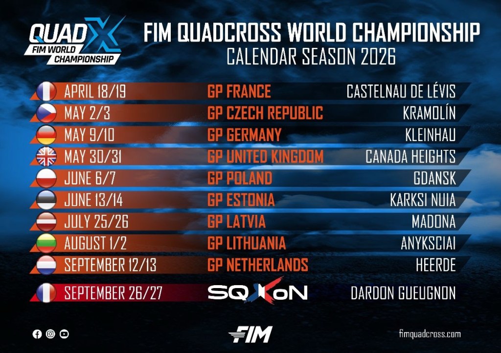 The FIM and APO Multimedia are pleased to confirm the 2026 calendars for the FIM SidecarCross World Championship (WSC), FIM QuadCross World Championship (WQC) and FIM SidecarCross & QuadCross of Nations (SQXoN).