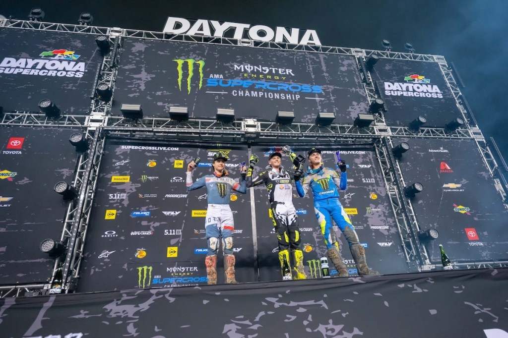 Daytona also signified the third race of SMX Next – Supercross, which featured 22 of the top A and B class prospects in amateur motocross. Two different winners stood atop the podium through the first two races and that trend continued as a third different up-and-coming racer claimed victory at Daytona. Triumph Racing’s Deacon Denno opened the 8 Minute + 1 Lap with the holeshot and led early before he gave way to Monster Energy Kawasaki Team Green’s Kade Johnson. Denno fought back to reclaim the lead after just a lap and carried on to become the third different SMX Next winner in as many races. It was the first SMX Next victory for the 17-year-old Texan as well as the first for the budding Triumph amateur program. He took the checkered flag 4.4 seconds ahead of 18-year-old Landen Gordon, who rides for Monster Energy Yamaha Star Racing, while 16-year-old Vincent Wey rounded out the podium for Monster Energy Kawasaki Team Green.