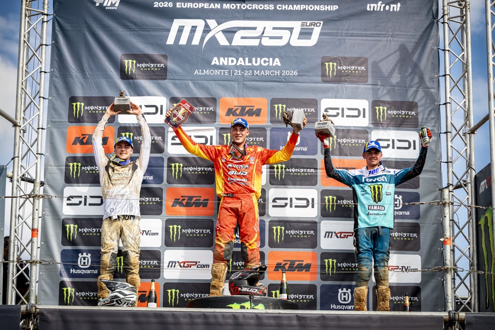 ALMONTE (Andalucia, Spain) 22nd March 2026 – The 2026 FIM Europe EMX250 and EMX125 Championships burst into life for the first time of the season in the demanding sands of Almonte, delivering a spectacular opening round. Under the eyes of an electrified Andalucian crowd, two standout performances defined the weekend.