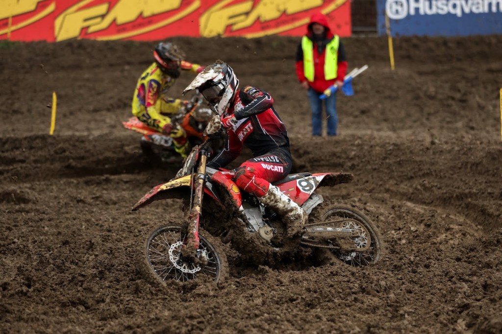 Simone Mancini from Beddini Racing Ducati Corse Factory MX2 Team grabbed the holeshot and led the early stages under heavy pressure from Venum BUD Racing Kawasaki’s Jake Cannon, who quickly established himself as a serious contender. Cannon made his first move early on, only for Mancini to respond and reclaim the lead shortly after.